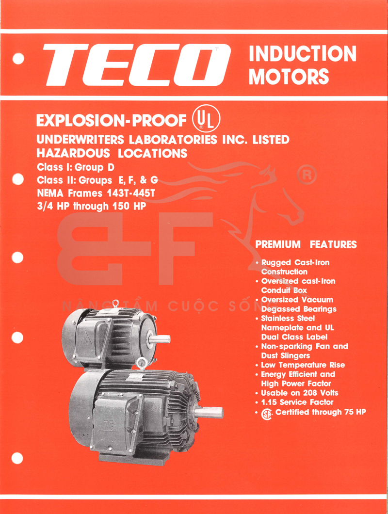 Động cơ TECO 3 Phase – Phòng chống cháy nổ (D2G4) được sản xuất theo tiêu chuẩn IEC gồm có 2 loại: Motor chống cháy nổ AEEDXU (chân đế) và AEVDXU (mặt bích). Những thông số cơ bản của động cơ chống cháy nổ: