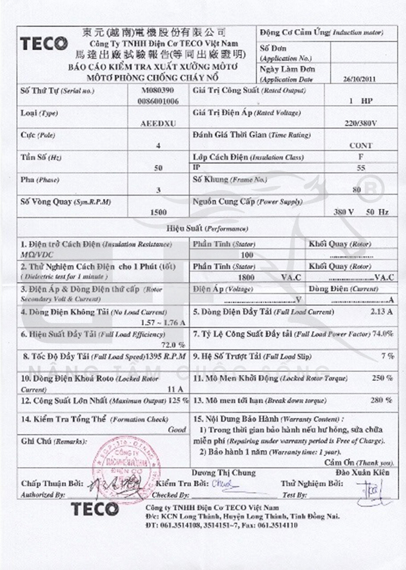 (Quạt chống cháy nổ do Công ty BHF Việt Nam cung cấp đều có Catalouge chi tiết và giấy kiểm tra xuất xưởng motor chống nổ do nhà máy TECO Long Thành cung cấp bản gốc)